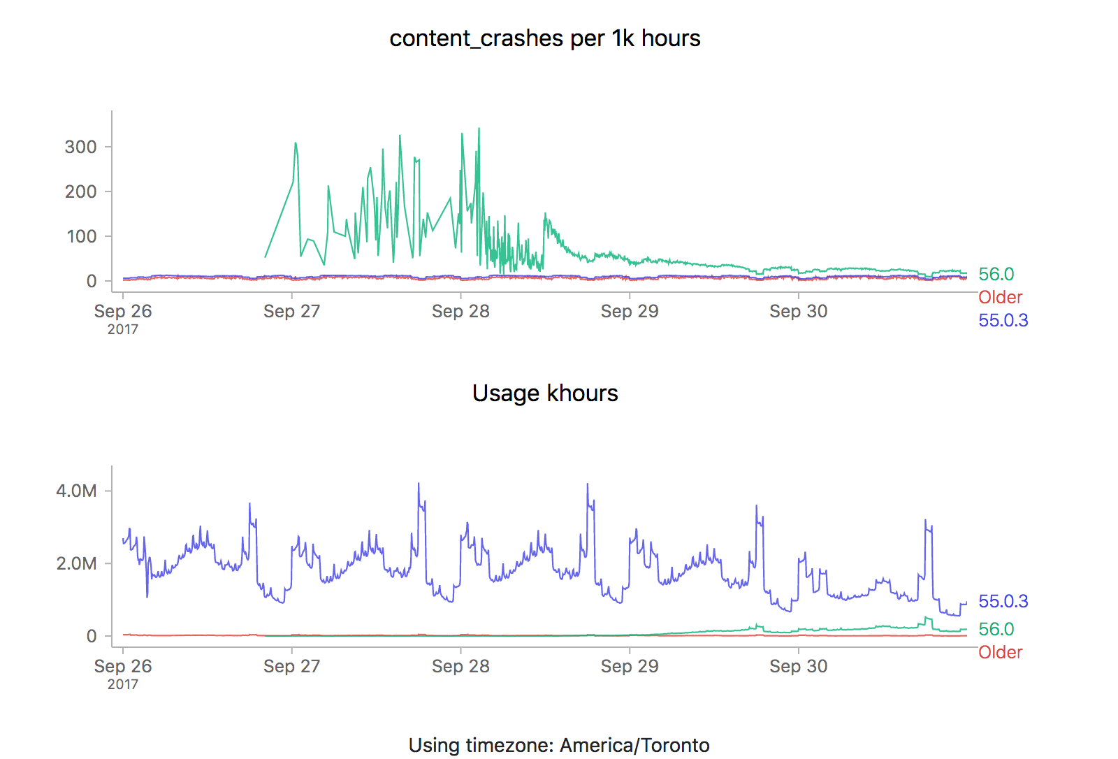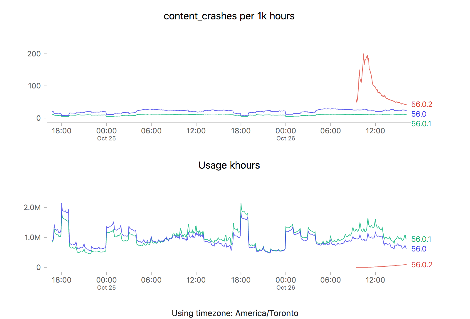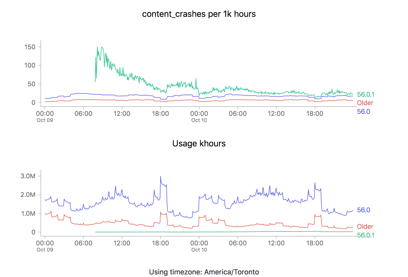 It just so happens that a new point release (56.0.2) just went out, so it’s a perfect opportunity to revisit this issue. Let’s take a look at what the graphs are saying (each of the images is also a link to the dashboard where they were generated):