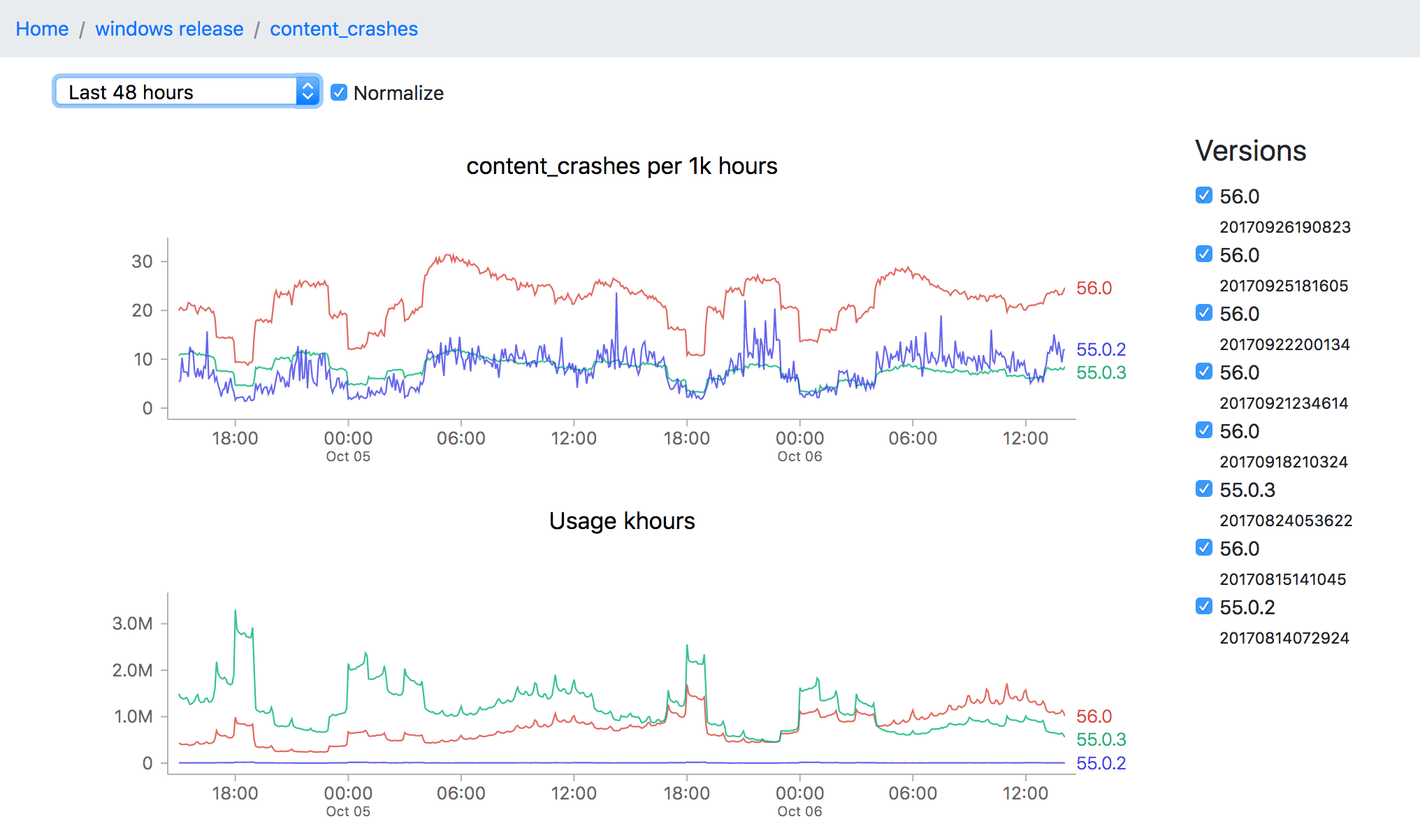 This particular screenshot shows the volume of content crashes (sampled every 5 minutes) over the last 48 hours on windows release. You’ll note that the later version (56.0) seems to be much crashier than earlier versions (55.0.3) which would seem to be a problem except that the populations are not directly comparable (since the profile of a user still on an older version of Firefox is rather different from that of one who has already upgraded). This is one of the still unsolved problems of this project: finding a reliable, automatable baseline of what an “acceptable result” for any particular measure might be.
