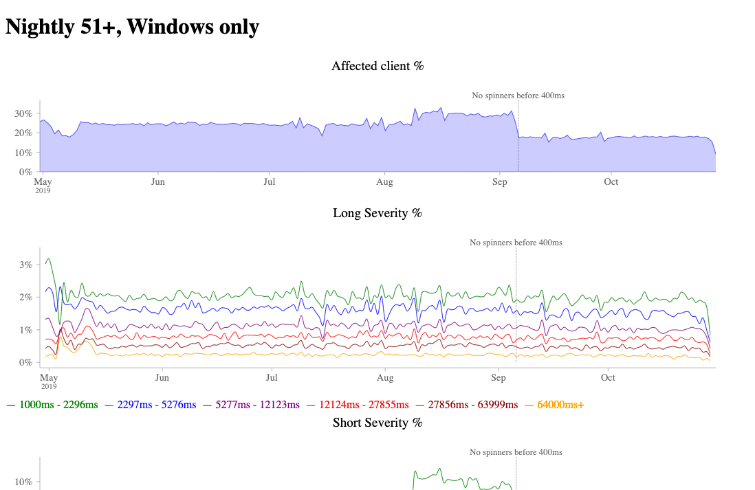 Essentially all this dashboard tells you is what percentage of the Firefox nightly population saw a tab spinner over the past 6 months. And of those that did see a tab spinner, what was the severity? Essentially we’re just trying to make sure that there are no major regressions of user experience (and also that efforts to improve things bore fruit):